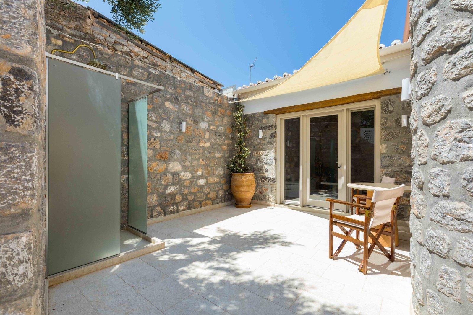 Access to the complex is via traditional cobblestone paths and steps, reflecting Hydra’s authentic character.