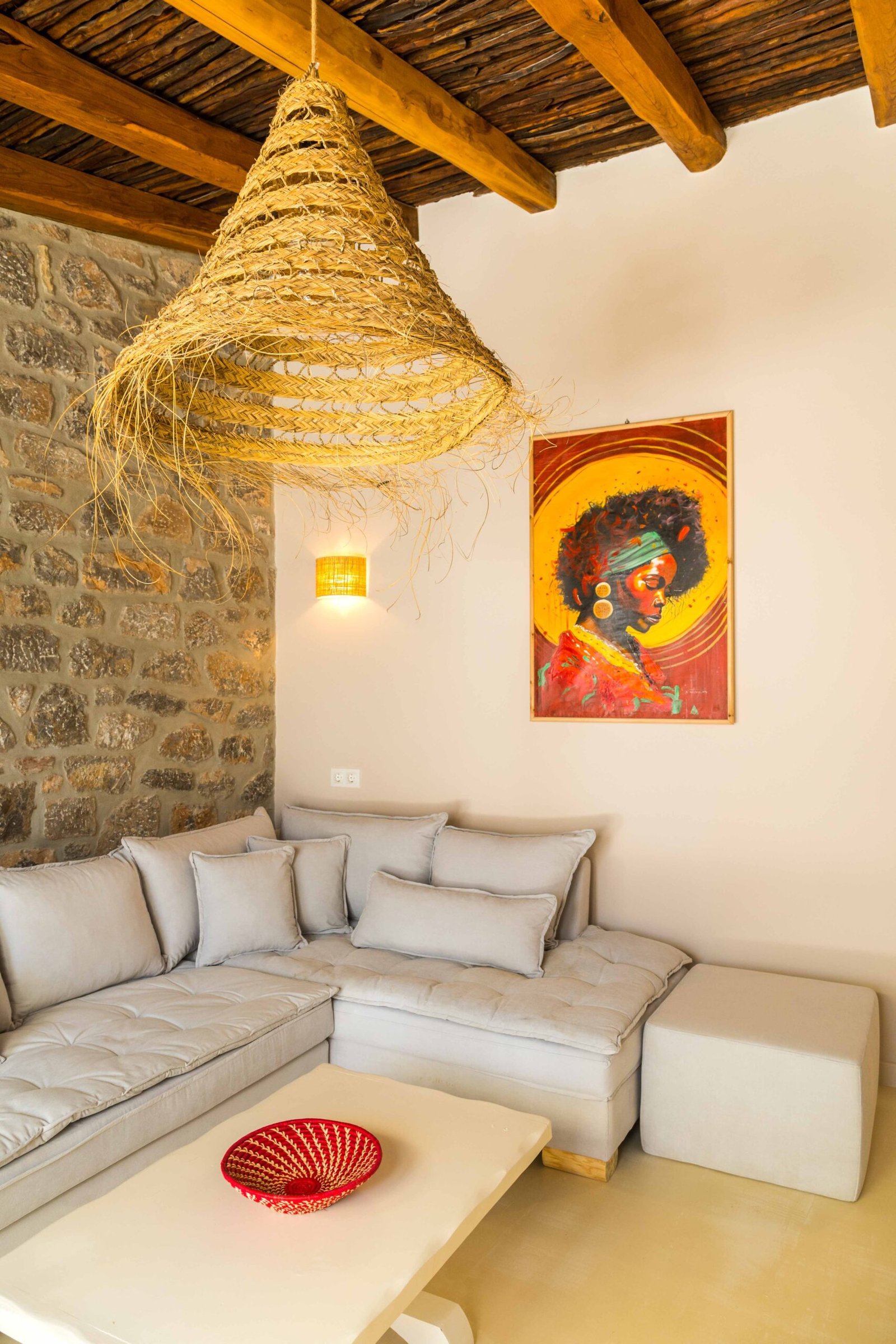 Comfortable living room with a large corner sofa, 43″ Smart TV, a wooden backgammon board & many literature books and a private yard with a table, chairs, and an outdoor shower.