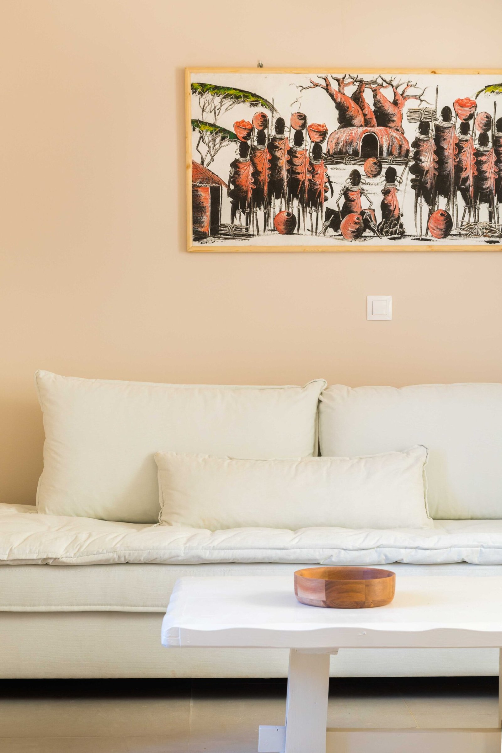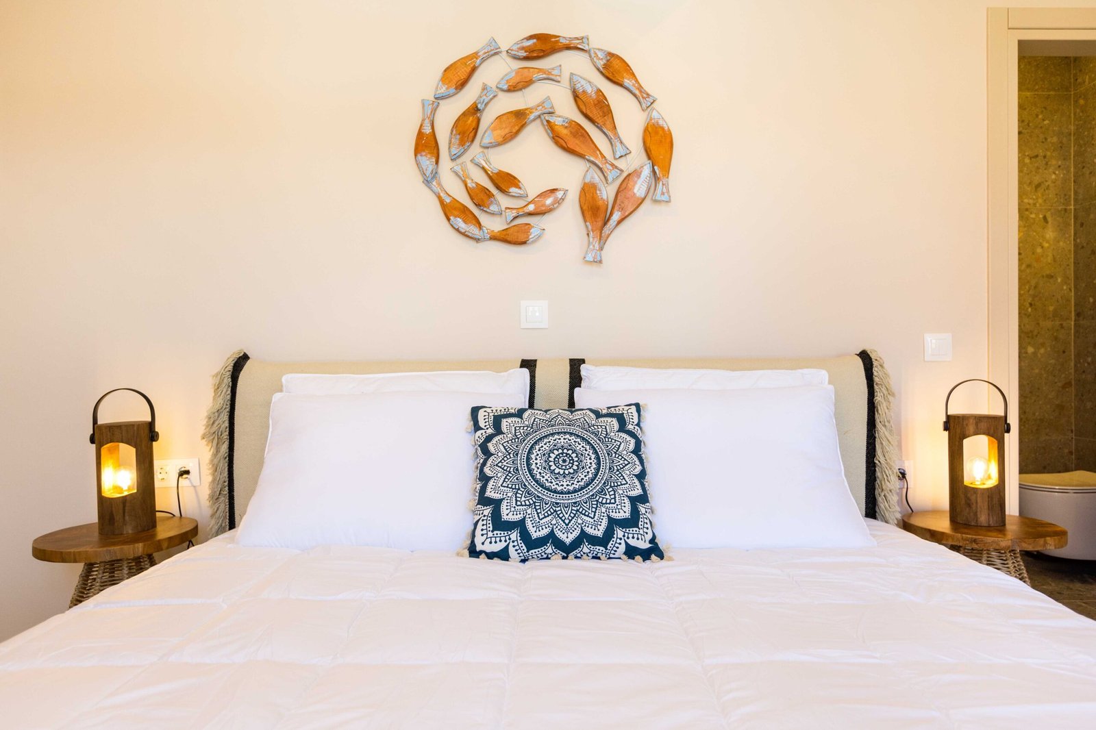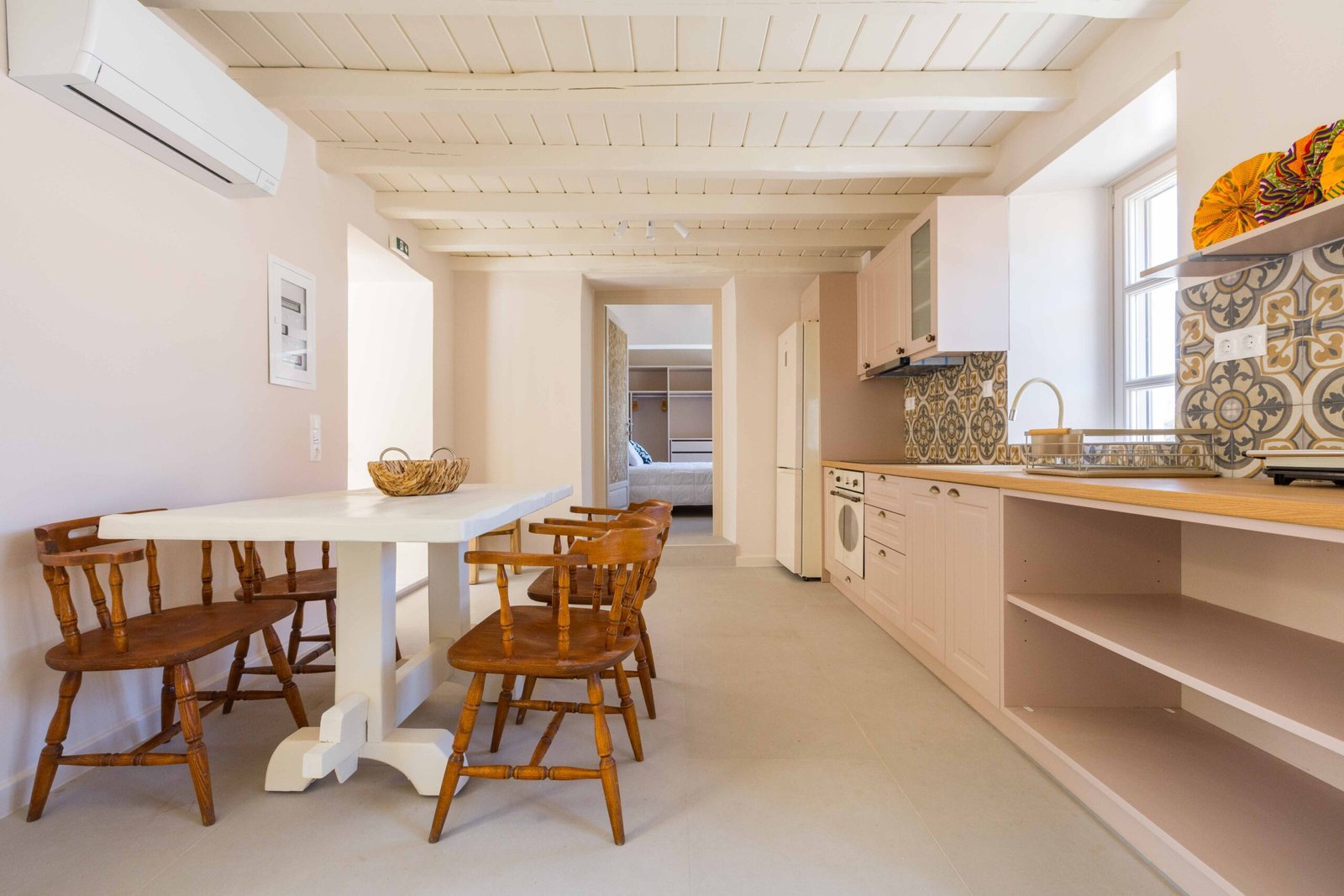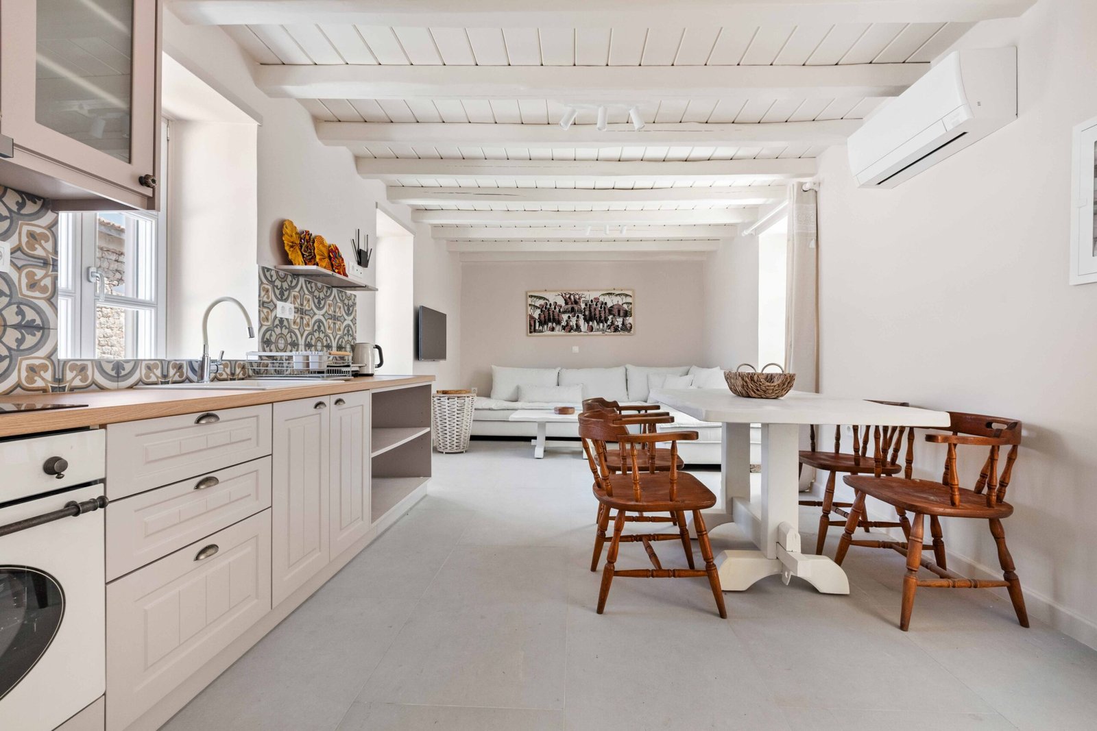 • The fully equipped kitchen includes a refrigerator, freezer, electric oven, stovetop, espresso machine, kettle, toaster, sandwich maker, cookware, plates, glasses, and cutlery. The space is complemented by a large corner sofa , a 43-inch Smart TV and a wooden backgammon board & many literature books, creating an ideal environment for relaxation.